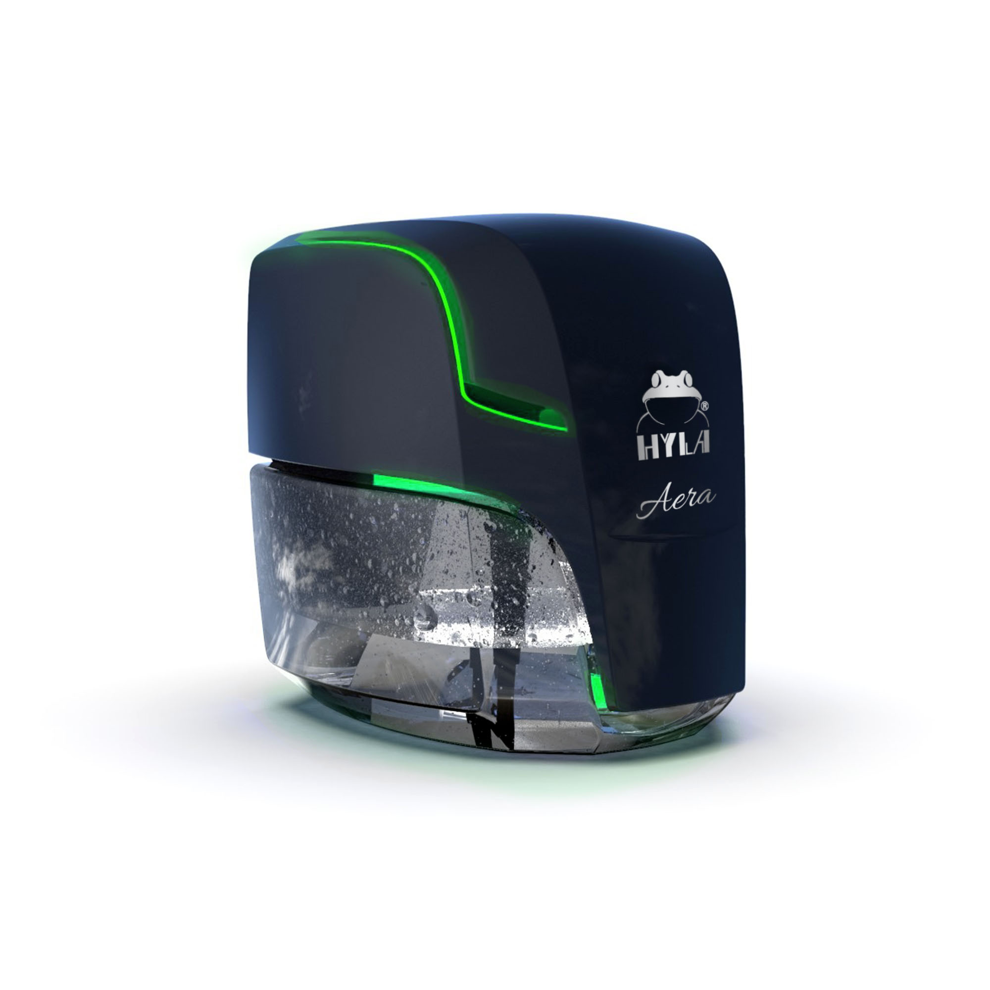 Der AERA Lufterfrischer besteht aus nur zwei Teilen: der Motor-Einheit mit LED-Lichtern und dem Wasserbehälter. Das glänzende schwarze Cover und das zentral platzierte HYLA-Logo machen deutlich, dass es sich um ein neues Produkt von HYLA handelt. Die Neuerung des AERA Lufterfrischers ist die HYLA AERA App, mit der das Gerät über das Smartphone gesteuert werden kann. Die App ermöglicht es dem Nutzer das Gerät zu Aktivieren und aus Millionen von Farben zu wählen oder seinen eigenen Lichteffekt zu kreieren.